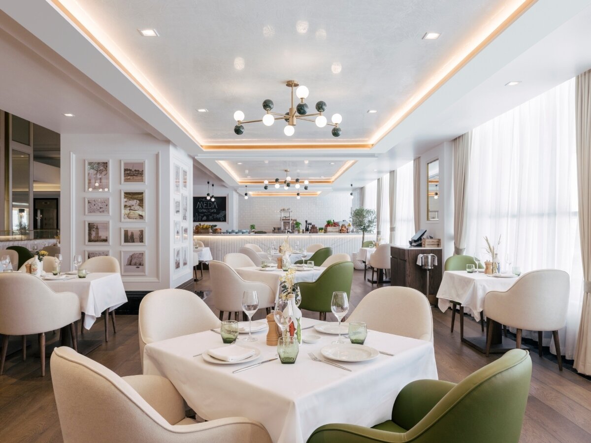 يتألق مطعم ميدا دبي بتصاميمه الداخلية الجميلة مع ألوان حيادية وهادئة وديكورات كلاسيكية بلمسات عصرية، ويوفّر أجواء مريحة وراقية.