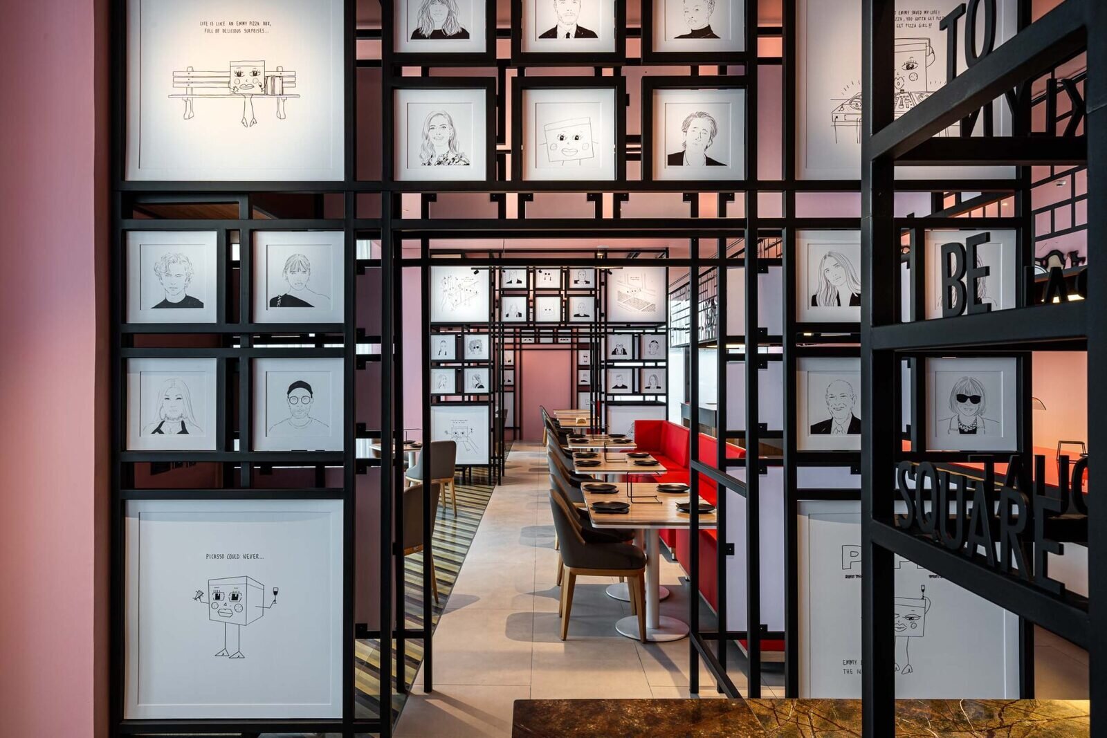 يتميز المطعم الجديد بتصميمه الذي يمزج اللون الوردي مع ديكورات خشبية ومجموعة من الرسومات اليدوية المؤطرة لمشاهير من سكان نيويورك، ومقاعد جلدية حمراء مذهلة.