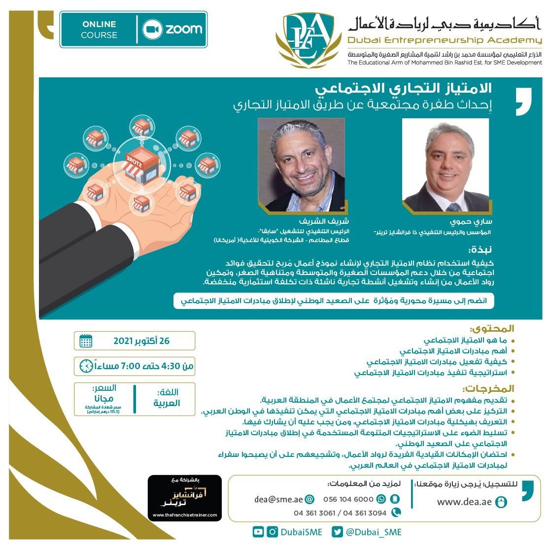 تقام ندوة افتراضية للامتياز التجاري الاجتماعي بالتعاون مع أكاديمية دبي لريادة الأعمال، الذراع التعليمي لمؤسسة محمد بن راشد لتنمية المشاريع الصغيرة والمتوسطة - الثلاثاء 26 أكتوبر 2021 - الساعة 4:30م بتوقيت دبي وسيكون عنوانها :