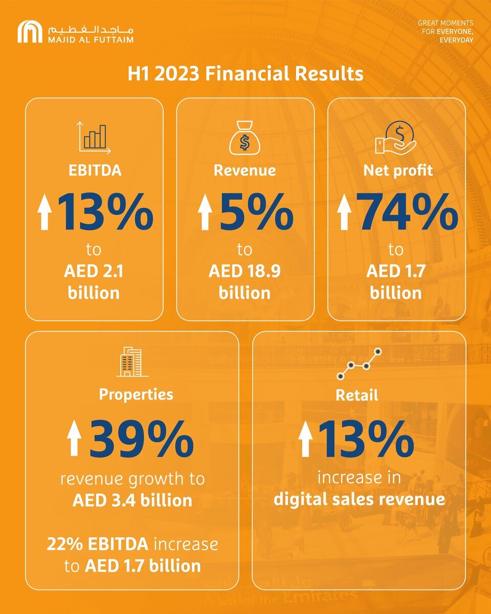 ماجد الفطيم للتجزئة: على إثر انخفاض قيمة العملات في نطاق تواجد أعمال الشركة، انخفضت بالتالي الإيرادات الإجمالية بنسبة 2% لتصل إلى 14,1 مليار درهم إماراتي، ما أدى إلى انخفاض الأرباح قبل احتساب الفوائد والضرائب والإهلاك والاستهلاك بنسبة 7%. وفي الأسواق التي حافظت على ثبات عُملاتها، سجلت أعمال التجزئة نموًا في الإيرادات بنسبة 8%، كما سجلت الأرباح قبل احتساب الفوائد والضرائب والإهلاك والاستهلاك زيادة نسبة 5%. فيما حافظت مبيعات التجزئة عبر القنوات الرقمية على أدائها القوي، مسجلة زيادة بنسبة 13% في الإيرادات لتصل إلى 1,2 مليار درهم إماراتي في النصف الأول من العام 2023.
