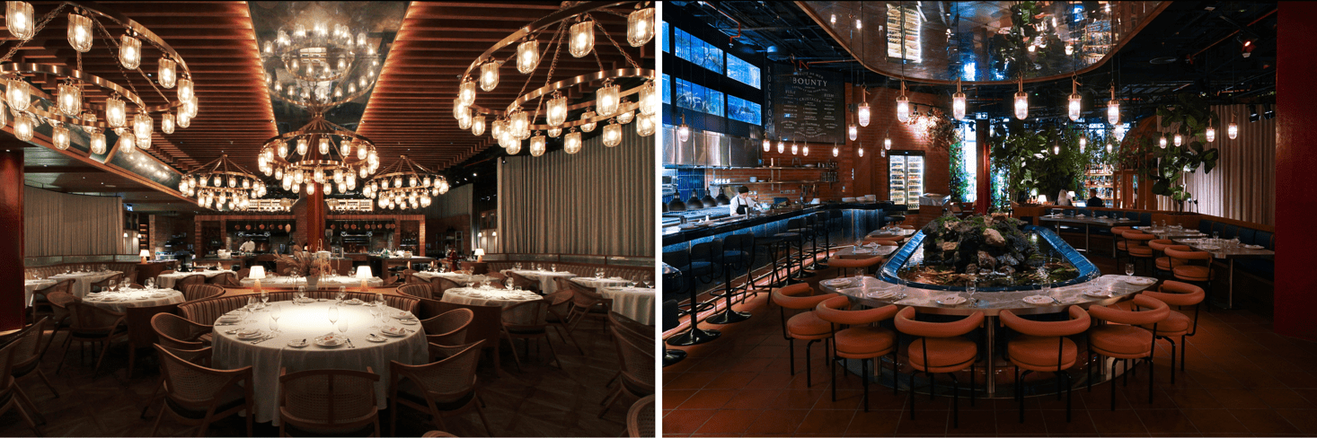 المطعم يشمل حوض أسماك للسلطعون والكركند النهري من غربي أستراليا، إلى جانب استراحة طولها 12 مترًا للمأكولات النيئة، ورُكن تقشير المحار الطازج، وبرّاد للأسماك الطازجة المثلّجة.