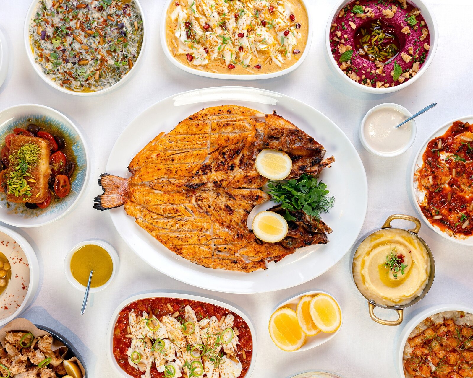 القائمة غنيّة بالأطباق التي تناسب أجواء الموسم، مع التركيز على الوفرة والمشاركة تماشيًا مع روح العيد. ترتكز التجربة على محطة عرض الأسماك الطازجة، حيث يمكن للضيوف استعراض تشكيلة ملوّنة من الصيد الطازج – بما فيها أسماك القاروص والدنيس والنهاش الأحمر. يُدعى الضيوف لاختيار نوع السمك المفضل لديهم وطريقة طهيه – سواءً مشوي أو مقلي أو صواني في الفرن مع توابل متوسطية، ليضفوا لمستهم الخاصة على الوجبة. تضفي هذه التجربة التفاعلية، المستوحاة من الأسواق البحرية، طابعًا احتفاليًا وعرضًا بصريًا مميزًا على الغداء.