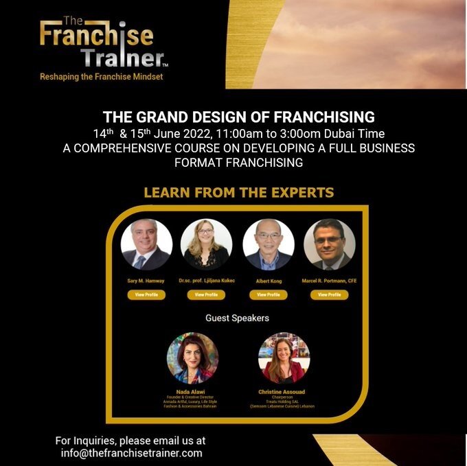 تقيم ( ذا فرنشايز تيرنر) دورة تدريبية حول المنظومة الكبرى للامتياز التجاري باللغة الإنكليزية وشروحات بالعربية وتهدف الى تعلم الطريقة الكاملة لتطوير نموذج الامتياز للعمل، وإتقان العملية الكاملة لتطوير أعمال امتياز مستدامة مع إمكانية النمو الإقليمي والدولي.