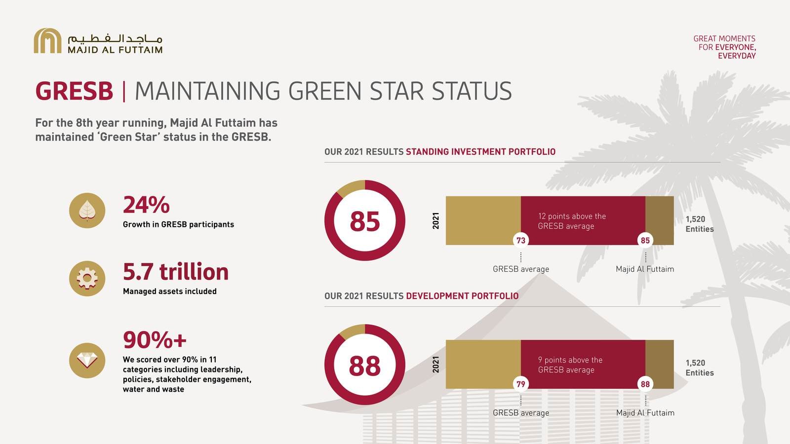 أعلنت "ماجد الفطيم"، الشركة الرائدة في مجال تطوير وإدارة مراكز التسوق والمدن المتكاملة ومنشآت التجزئة والترفيه في منطقة الشرق الأوسط وأفريقيا وآسيا، مؤخرًا، حصولها على أعلى تصنيف لمعيار "النجمة الخضراء" على مؤشر الاستدامة العقارية العالمي GRESBللعام الثامن على التوالي، إذ نجحت الشركة في تطبيق ممارسات متميزة في مجال الاستدامة عبر محفظة أعمالها، وسجلت 85 نقطة و88 نقطة لكل من أعمال الاستثمار الدائم والتطوير العقاري على التوالي.